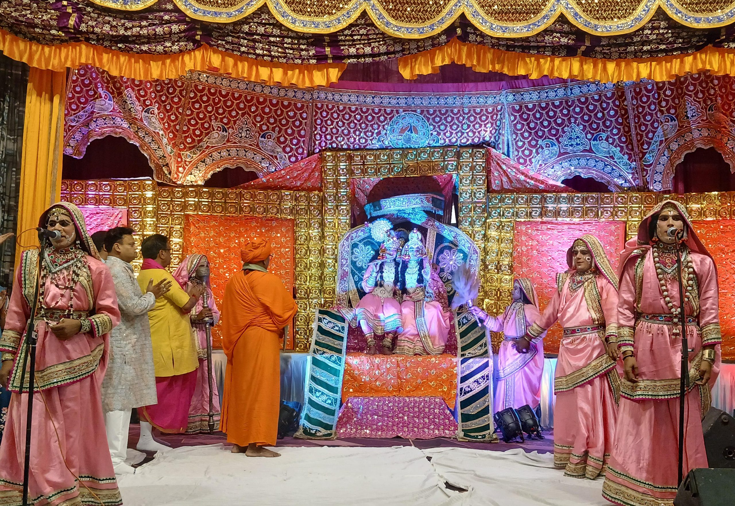 कार्यक्रम में श्रीकृष्ण जन्म की हर्षोल्लासमयी झांकी, भजनों की गूंज और श्री गिरिराज महाराज के आलौकिक श्रृंगार ने भक्तों को मंत्रमुग्ध कर दिया।
