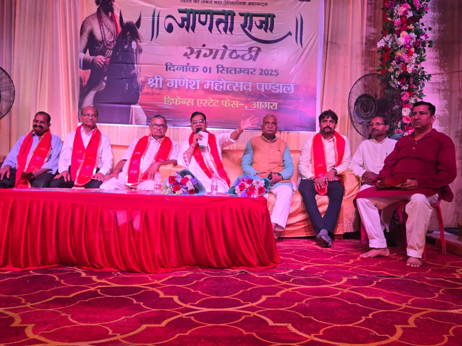 आगरा। ताज नगरी का सांस्कृतिक परिदृश्य इस बार एक ऐतिहासिक दृश्य का साक्षी बनने जा रहा है। दिव्य प्रेम सेवा मिशन द्वारा भव्य “जाणता राजा” महा-नाट्य का आयोजन 4 से 9 अक्टूबर तक कलाकृति प्रांगण में किया जाएगा। इसी क्रम में सोमवार को डिफेंस एस्टेट फेस-1 में श्री साँई-गणेश महोत्सव समिति एवं श्री साँई सेवा मित्र मण्डल द्वारा आयोजित गणेश महोत्सव में सभा का आयोजन हुआ और महा नाट्य के संदर्भ में विशेष जानकारी दी गई।